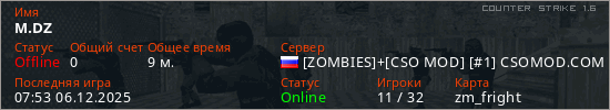 Играет на Counter Strike 1.6 сервере. Страна: РоссияПервый раз замечен 00:54 04.12.2025