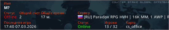 Играет на Counter Strike Global Offensive сервере. Страна: РоссияПервый раз замечен 20:32 04.03.2026
