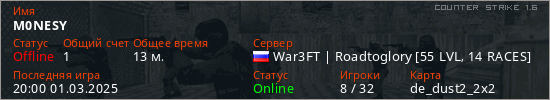 Играет на Counter Strike 1.6 сервере. Страна: РоссияПервый раз замечен 16:10 01.03.2025