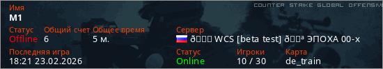 Играет на Counter Strike Global Offensive сервере. Страна: РоссияПервый раз замечен 17:56 23.02.2026