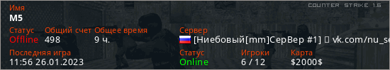 Играет на Counter Strike 1.6 сервере. Страна: РоссияПервый раз замечен 21:40 21.12.2021