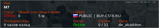 Играет на Counter Strike 1.6 сервере. Страна: РоссияПервый раз замечен 17:43 15.03.2026