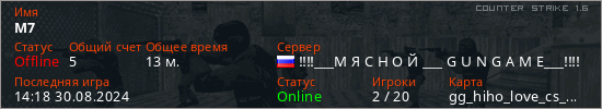 Играет на Counter Strike 1.6 сервере. Страна: РоссияПервый раз замечен 16:41 12.06.2024