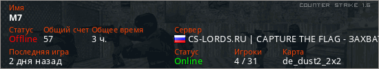 Играет на Counter Strike 1.6 сервере. Страна: РоссияПервый раз замечен 18:58 06.03.2022