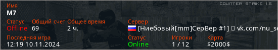 Последний раз был в сети 12:19 10.11.2024 Игрок с таким ником замечен на 29 серверах