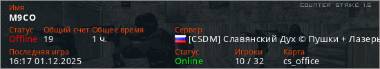 Играет на Counter Strike 1.6 сервере. Страна: РоссияПервый раз замечен 16:16 29.03.2024