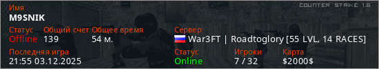 Играет на Counter Strike 1.6 сервере. Страна: РоссияПервый раз замечен 20:34 27.03.2021