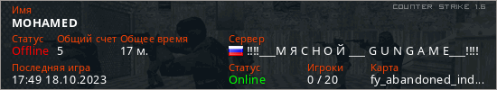 Играет на Counter Strike 1.6 сервере. Страна: РоссияПервый раз замечен 15:12 13.10.2023