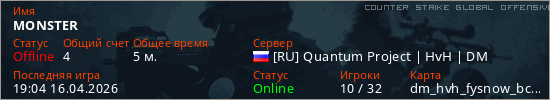 Играет на Counter Strike Global Offensive сервере. Страна: РоссияПервый раз замечен 18:41 16.04.2026
