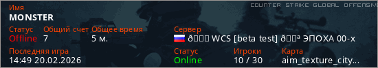 Играет на Counter Strike Global Offensive сервере. Страна: РоссияПервый раз замечен 14:45 20.02.2026