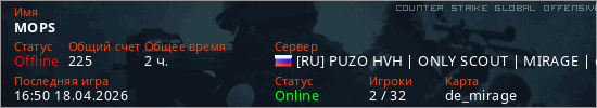 Играет на Counter Strike Global Offensive сервере. Страна: РоссияПервый раз замечен 17:10 20.03.2026