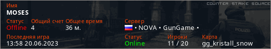 Играет на Counter Strike Source сервере. Страна: РоссияПервый раз замечен 08:50 19.06.2023