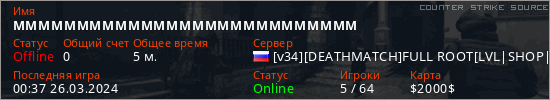 Играет на Counter Strike Source сервере. Страна: РоссияПервый раз замечен 00:08 26.03.2024