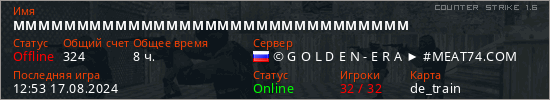 Последний раз был в сети 12:53 17.08.2024 Игрок с таким ником замечен на 20 серверах