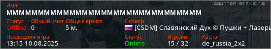 Последний раз был в сети 13:15 10.08.2025 Игрок с таким ником замечен на 20 серверах