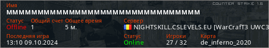 Последний раз был в сети 13:10 09.10.2024 Игрок с таким ником замечен на 20 серверах