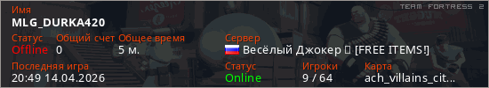 Играет на Team Fortress 2 сервере. Страна: РоссияПервый раз замечен 20:35 14.04.2026
