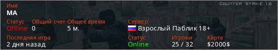 Играет на Counter Strike 1.6 сервере. Страна: РоссияПервый раз замечен 20:34 13.12.2025