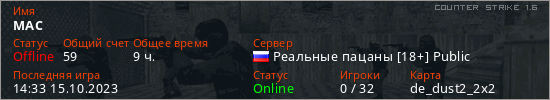 Играет на Counter Strike 1.6 сервере. Страна: РоссияПервый раз замечен 21:51 17.06.2023