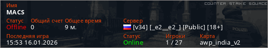 Играет на Counter Strike Source сервере. Страна: РоссияПервый раз замечен 15:08 16.01.2026