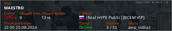 Играет на Counter Strike 1.6 сервере. Страна: РоссияПервый раз замечен 21:10 25.08.2024