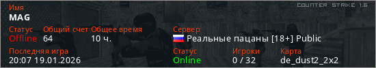 Играет на Counter Strike 1.6 сервере. Страна: РоссияПервый раз замечен 22:55 05.03.2023