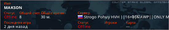 Играет на Counter Strike Global Offensive сервере. Страна: РоссияПервый раз замечен 19:51 25.01.2026