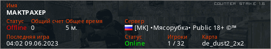 Играет на Counter Strike 1.6 сервере. Страна: РоссияПервый раз замечен 03:58 09.06.2023