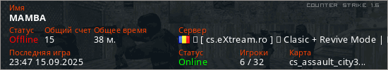 Играет на Counter Strike 1.6 сервере. Страна: РумынияПервый раз замечен 19:46 22.12.2024