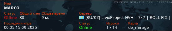 Играет на Counter Strike Global Offensive сервере. Страна: КазахстанПервый раз замечен 23:42 14.09.2025