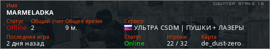 Играет на Counter Strike 1.6 сервере. Страна: РоссияПервый раз замечен 09:29 02.01.2026