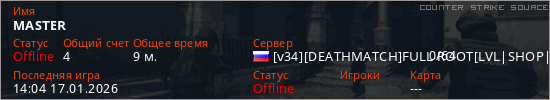 Играет на Counter Strike Source сервере. Страна: РоссияПервый раз замечен 19:54 16.01.2026