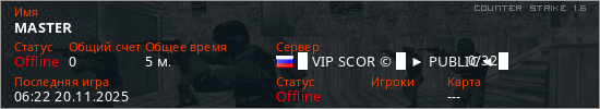 Играет на Counter Strike 1.6 сервере. Страна: РоссияПервый раз замечен 06:20 20.11.2025