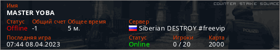 Играет на Counter Strike Source сервере. Страна: РоссияПервый раз замечен 07:24 08.04.2023