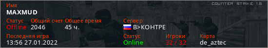 Играет на Counter Strike 1.6 сервере. Страна: РоссияПервый раз замечен 12:30 08.07.2021