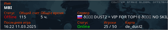 Играет на Counter Strike Global Offensive сервере. Страна: РоссияПервый раз замечен 21:41 10.03.2025