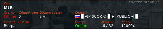Играет на Counter Strike 1.6 сервере. Страна: РоссияПервый раз замечен 20:04 02.11.2025