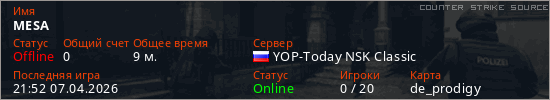 Играет на Counter Strike Source сервере. Страна: РоссияПервый раз замечен 21:26 03.04.2026