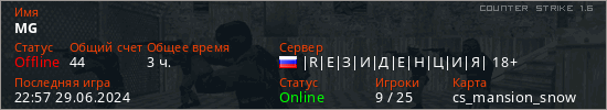 Играет на Counter Strike 1.6 сервере. Страна: РоссияПервый раз замечен 23:51 18.03.2021