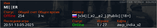Играет на Counter Strike Source сервере. Страна: РоссияПервый раз замечен 18:43 06.10.2023
