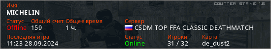 Играет на Counter Strike 1.6 сервере. Страна: РоссияПервый раз замечен 21:28 18.10.2023