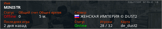 Играет на Counter Strike 1.6 сервере. Страна: РоссияПервый раз замечен 12:43 08.02.2026