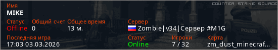 Играет на Counter Strike Source сервере. Страна: РоссияПервый раз замечен 11:23 03.03.2026