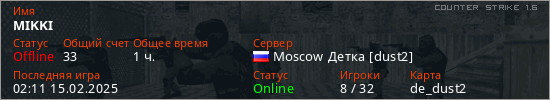 Последний раз был в сети 02:11 15.02.2025 Игрок с таким ником замечен на 12 серверах