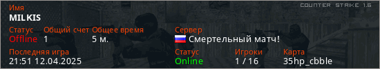 Играет на Counter Strike 1.6 сервере. Страна: РоссияПервый раз замечен 21:38 12.04.2025