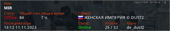Играет на Counter Strike 1.6 сервере. Страна: РоссияПервый раз замечен 10:36 25.10.2022