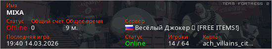 Играет на Team Fortress 2 сервере. Страна: РоссияПервый раз замечен 21:00 08.03.2026