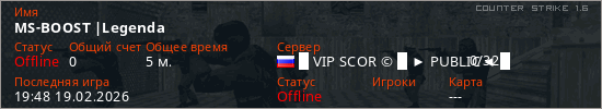 Играет на Counter Strike 1.6 сервере. Страна: РоссияПервый раз замечен 19:46 19.02.2026