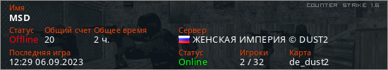 Играет на Counter Strike 1.6 сервере. Страна: РоссияПервый раз замечен 15:24 20.04.2023