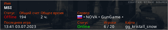 Играет на Counter Strike Source сервере. Страна: РоссияПервый раз замечен 19:56 11.11.2022